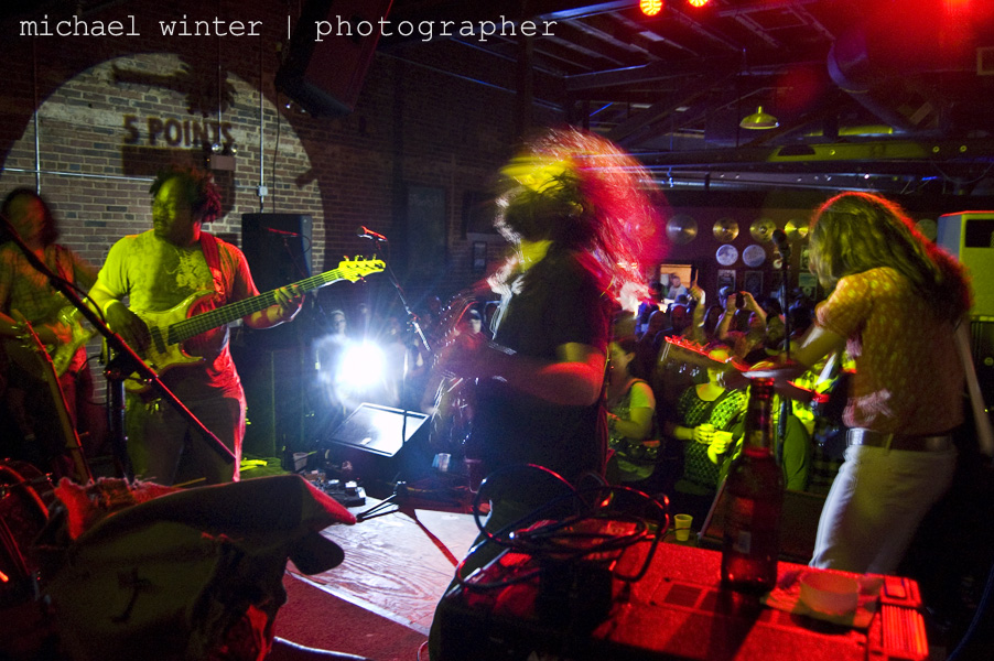 On tour I carry a Nikon D50 with a kit lens and a 50mm 1.8 lens. It’s not a full frame and the higher ISO settings SUCK. I work around this problem by using a mono pod. Best investment EVER. It’s super handy for minimizing camera shake, and I use it a lot to get different perspective. Example: Get your exposure setting where you want it, set the swivel (if your mono pod is equipped) to the approximate angle to get the coverage you need, set the timer, hit the shutter, stick that puppy up in the air and hold it steady till it clicks. Then take a look… Might take some trial and error, but you will get some really cool perspective shots that you wouldn’t get otherwise.